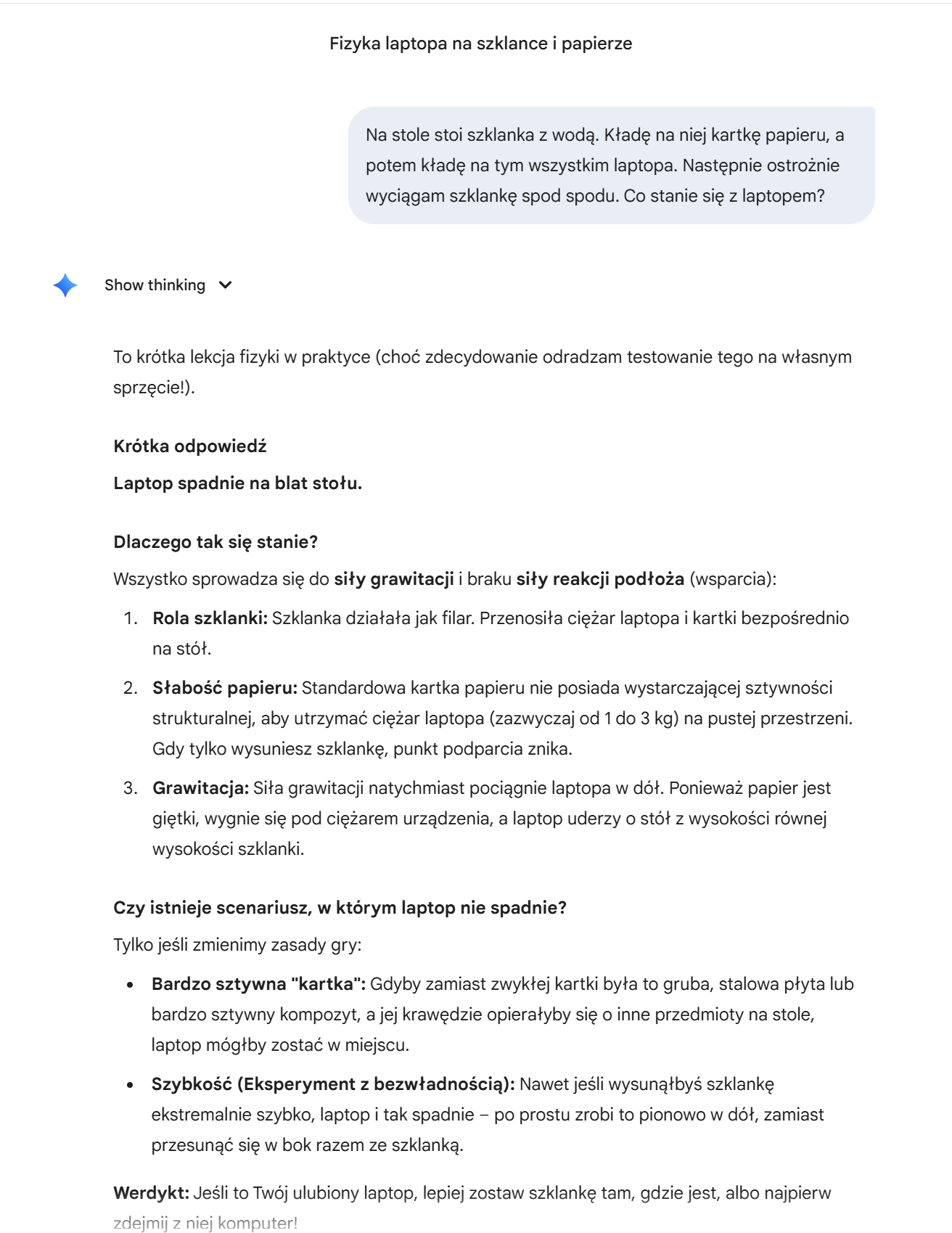 „Na stole stoi szklanka z wodą. Kładę na niej kartkę papieru, a potem kładę na tym wszystkim laptopa. Następnie ostrożnie wyciągam szklankę spod spodu. Co stanie się z laptopem?”