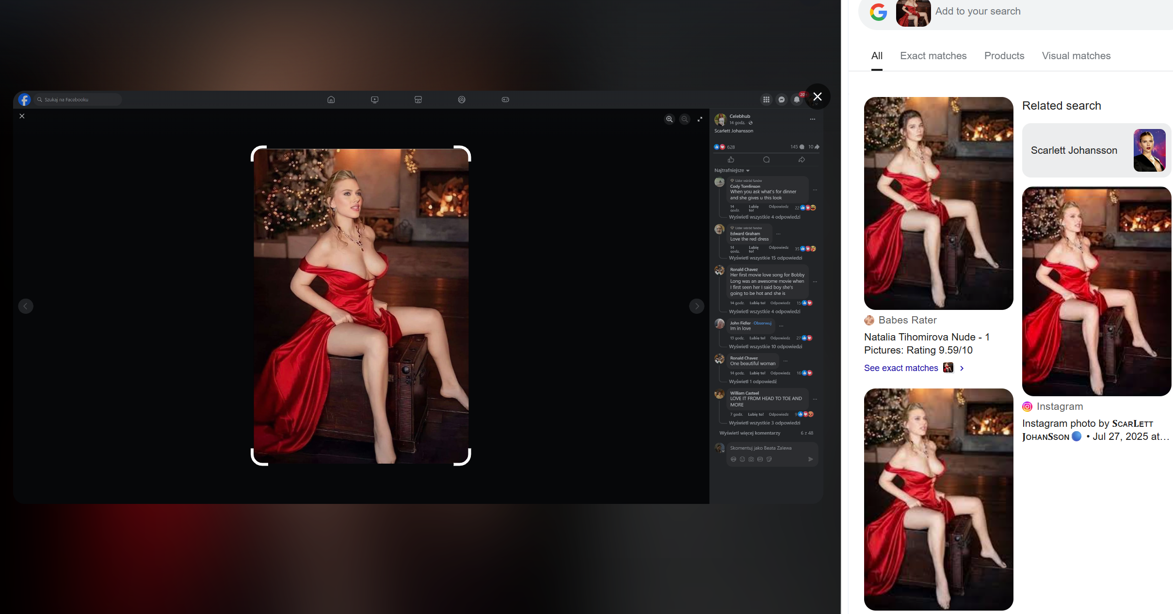Szybkie sprawdzenie w Google Lens zajęło mi dosłownie 15 sekund. Wynik? Zdjęcie krąży po profilach fanów, ale istnieje też jego druga wersja. Ta sama poza, sukienka, naszyjnik, a nawet choinka w tle. Zmieniła się tylko twarz – należała do rosyjskiej nude model. To, co widziały setki osób, było sprawnie wykonanym deepfake’em.