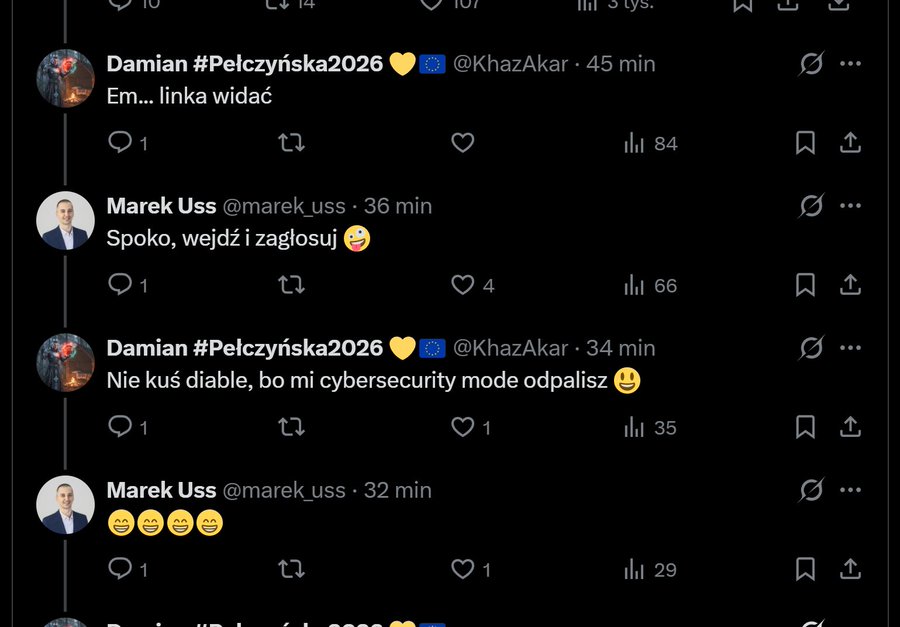 Zaczyna się niewinnie. Ktoś zauważa błąd (widoczny link do głosowania). Co robi ekspert? Zamiast szybko usunąć post, idzie w zaparte z uśmiechniętą emotką: „Spoko, wejdź i zagłosuj”. To ten moment, w którym „przeliczenie się” wchodzi na pełnych obrotach. To brawura godna lepszej sprawy.